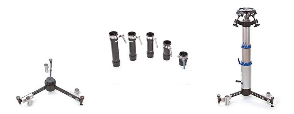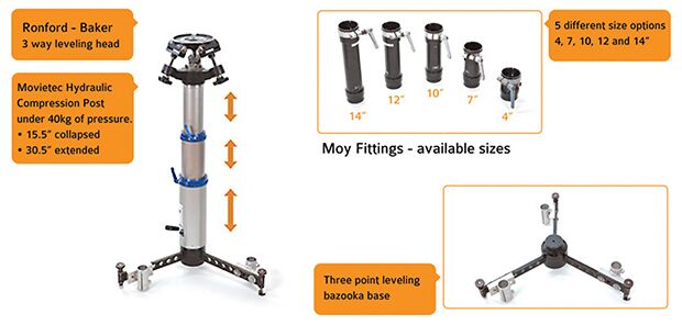 Our Bazooka camera mount consists of Ronford-Baker multiple length risers, base and 3-way leveling head. Also included is an adjustable Movietech gas riser for on-the-fly adjustments.