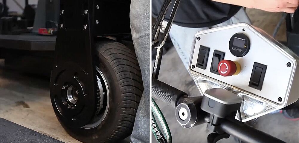 The Motivator is our solution to moving large camera cranes by allowing one person to position and maneuver the Super Technocrane 50 on the film set without taxing the grip department. The unit is modular and fits on any 30’ or 50’ Super Technocrane. The Motivator can be mounted and dismounted in minutes. A control console mounts to the existing steering bar, allowing the operator to power the unit, control speed and direction and as well set the parking brake.