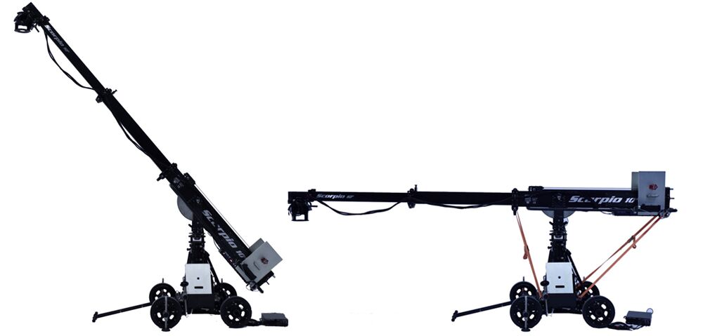 The NEW Scorpio 10’ is a two-section telescopic arm for standard dolly. Servicevision has designed this two section telescopic arm to provide to any dolly in the market the possibility of adding a telescopic arm to its featuring. The Scorpio 10’ has an optional dolly/base with articulated arms that allows to change its width for standard dolly tracks of 62 cm and for 40 cm Scorpio tracks, it also allows a very small and compact configuration for taxiing to go through standard office doors (80 cm)… place your Scorpio 10’ everywhere needed.
